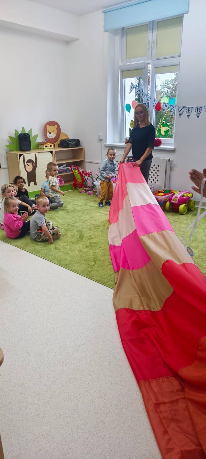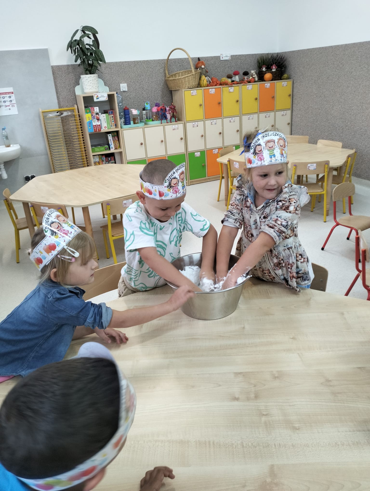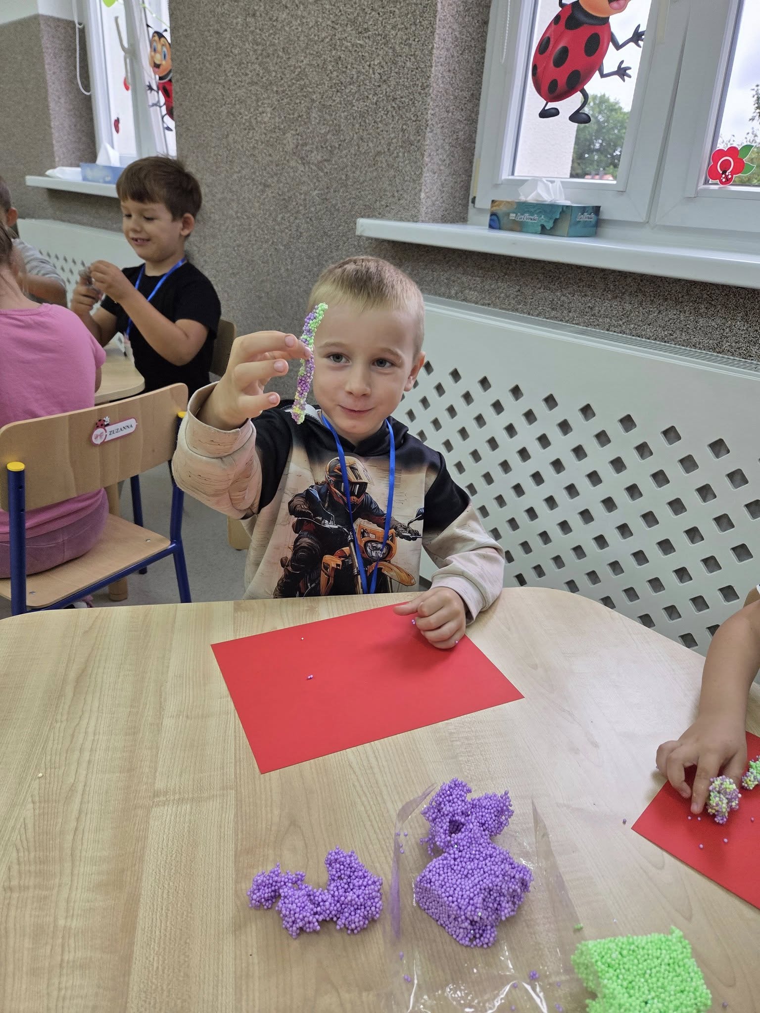 Dzieci uczestniczyły w różnorodnych atrakcjach – bawiły się z chustą animacyjną, brały udział w zabawach sensorycznych oraz pokonywały ścieżkę zmysłów. Przedszkolaki samodzielnie wykonały także ciastolinę i piankolinę, ![]()