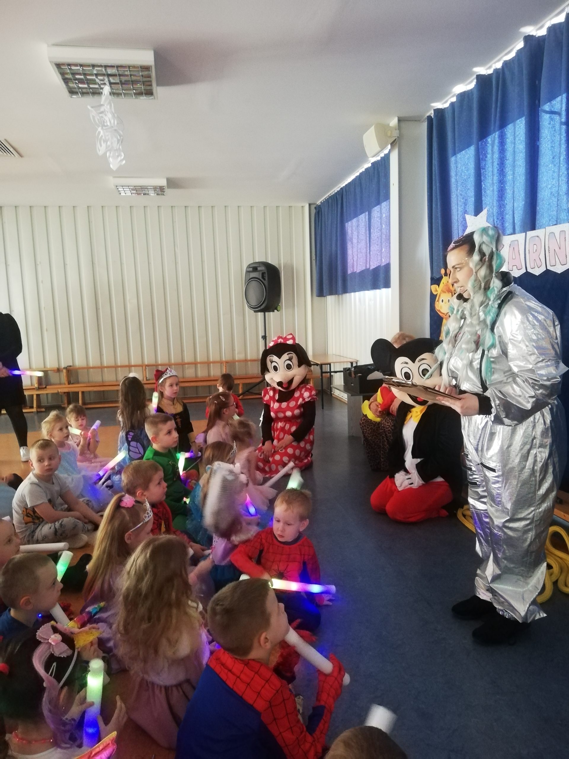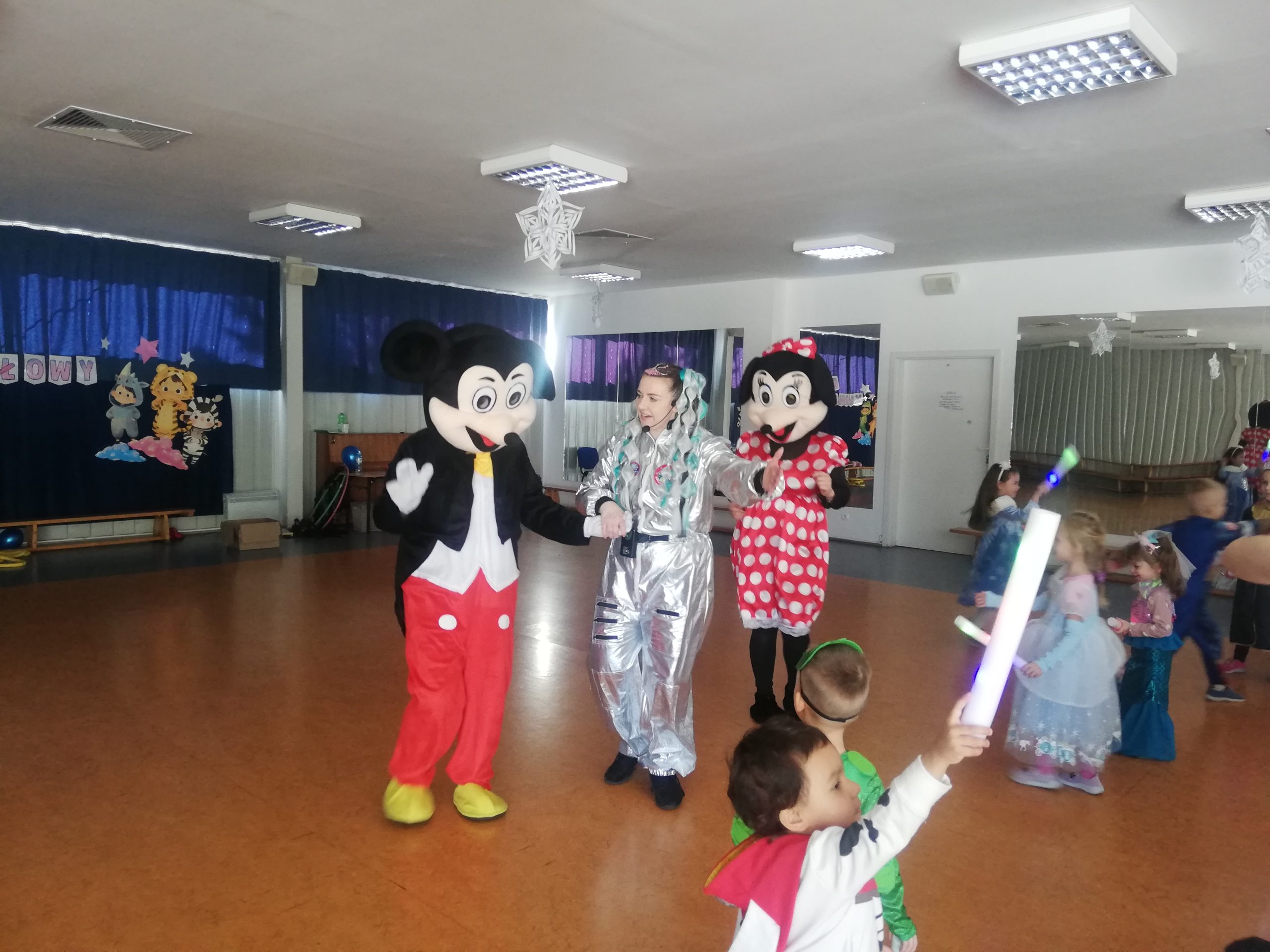 Nie sposób zliczyć i wymienić tych wszystkich postaci. Rozpoznać dzieci było bardzo trudno. Wystrój sali wprowadził w radosny nastrój oraz zachęcał wszystkich do wesołej zabawy prowadzonej przez panią animator. Na twarzach wszystkich malował się uśmiech, który nie znikał mimo chwilowego zmęczenia. Pod koniec Balu na sali pojawili się mili goście- Myszka Miki wraz z Mini. Dzieci z wielką radością przywitały się z gośćmi i zaprosiły ich do wspólnej zabawy.