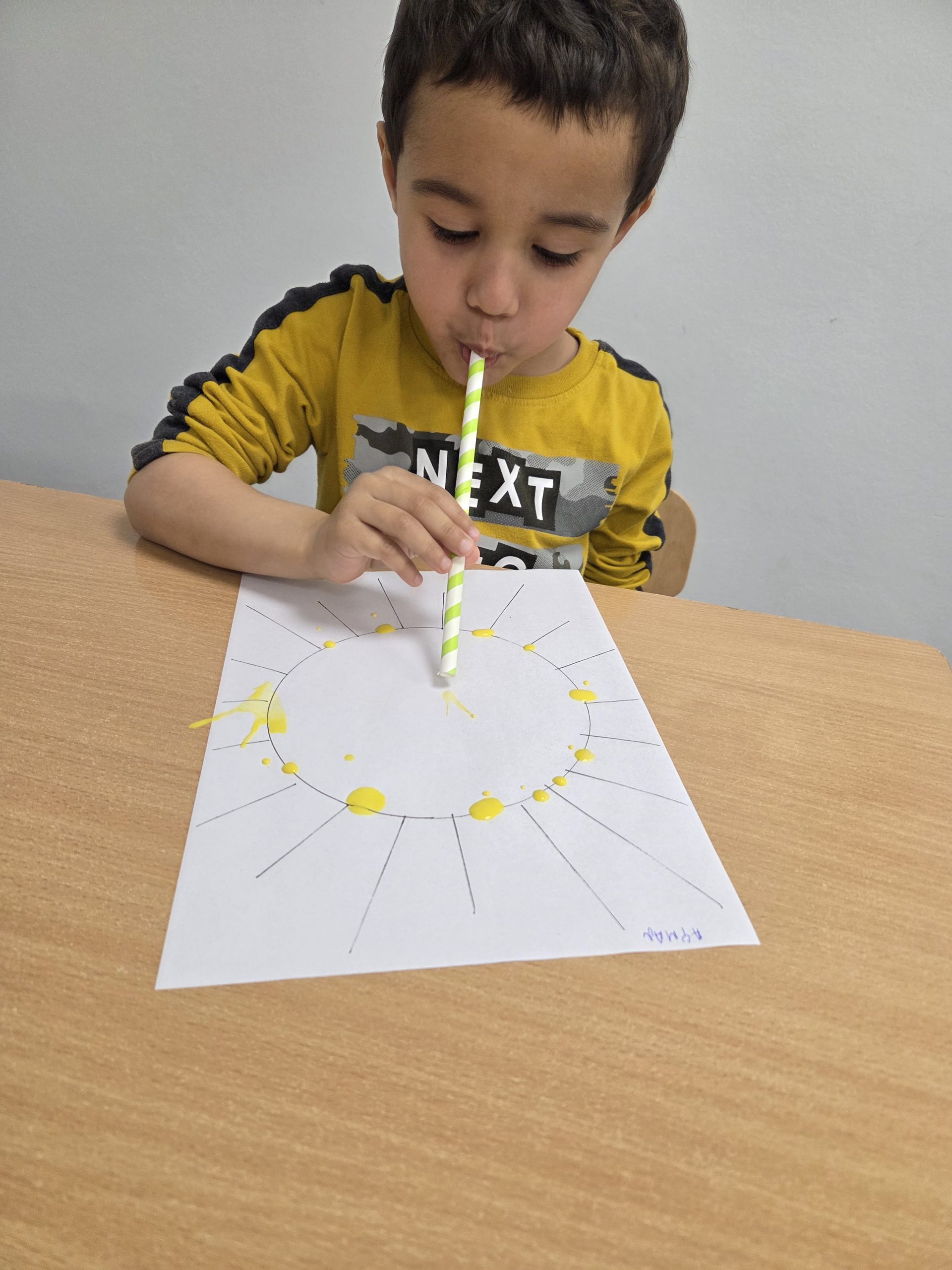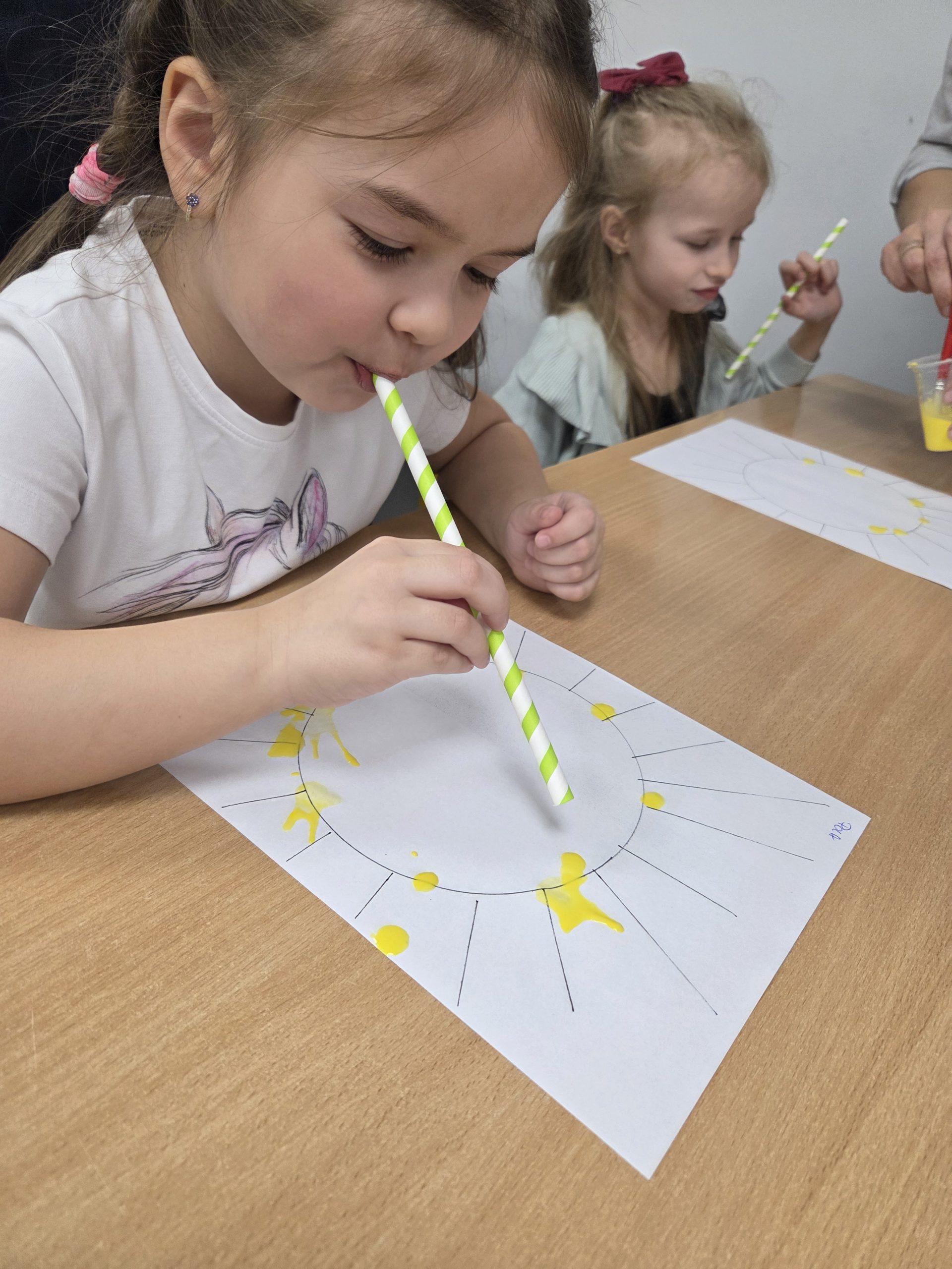 Na zakończenie zajęć przedszkolaki wykonały pracę plastyczną, która jednocześnie wspierała ćwiczenia prawidłowego toru oddechowego. Dzieci za pomocą słomek dmuchały krople farby, tworząc barwne, rozgałęziające się wzory. Ta zabawa nie tylko pobudzała kreatywność, ale także doskonaliła umiejętność kontrolowanego, wydłużonego wydechu.