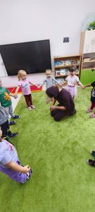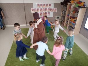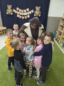 Wyjątkowym wydarzeniem były odwiedziny dużego misia, który pojawił się w naszym przedszkolu, aby wspólnie z dziećmi świętować ten szczególny dzień. Przedszkolaki z radością przywitały go, a następnie tańczyły z nim. ![]()