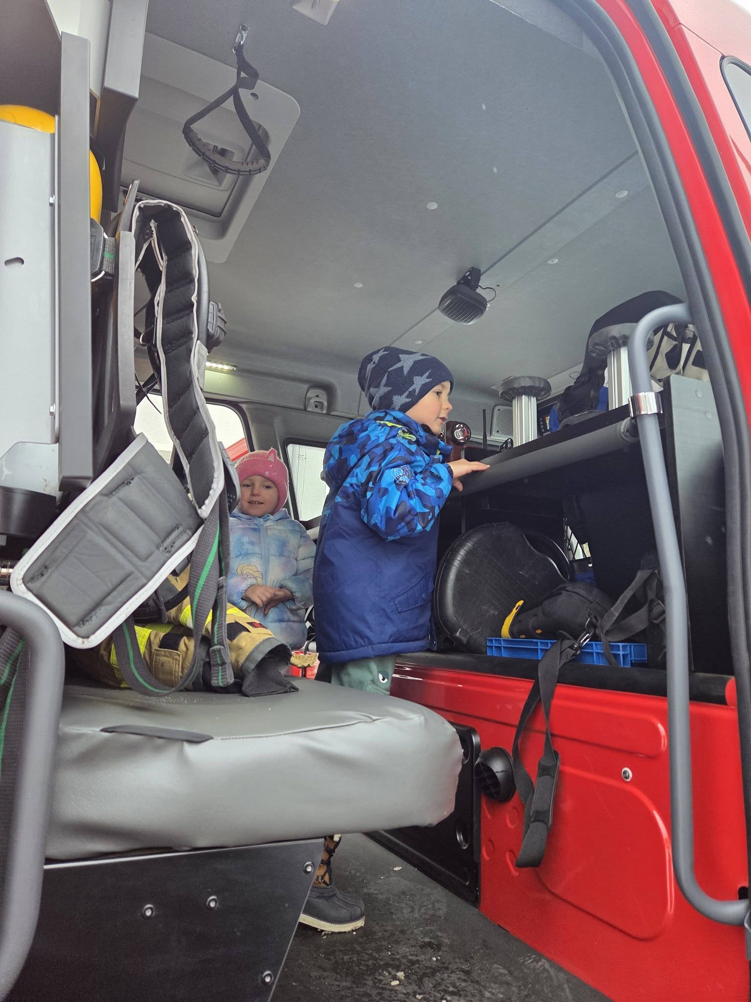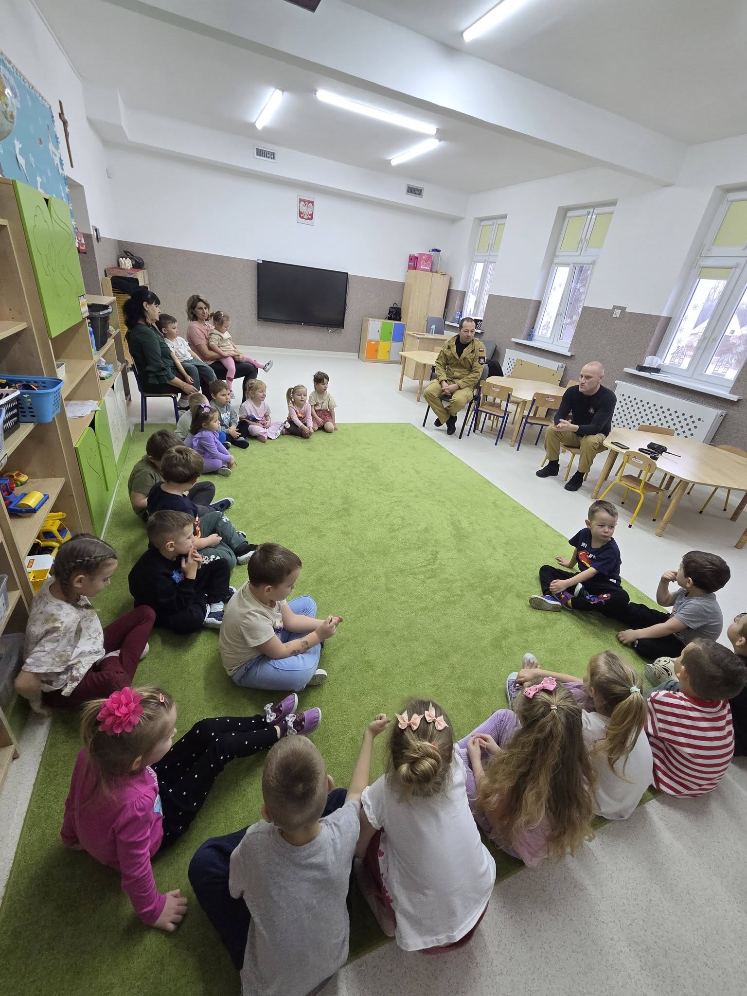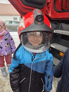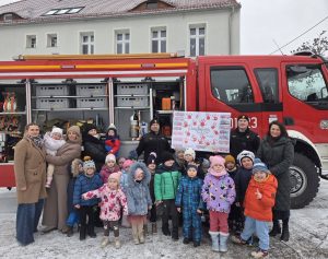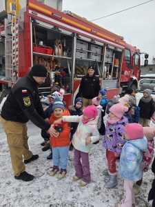 Podczas pogadanki dzieci aktywnie uczestniczyły w rozmowie i chętnie odpowiadały na pytania. Dużą atrakcją była prezentacja wozu strażackiego. Przedszkolaki miały możliwość obejrzenia wyposażenia pojazdu oraz wejścia do jego wnętrza, co sprawiło im wiele radości.
