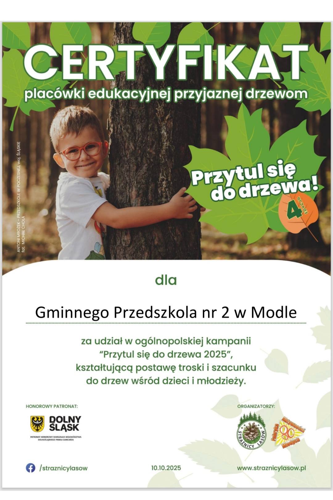 Miło nam poinformować, że Gminne Przedszkole Nr 2 w Modle po raz drugi wzięło udział w ogólnopolskiej kampanii „Strażnicy Lasów – Przytul się do drzewa 2025”.![]()