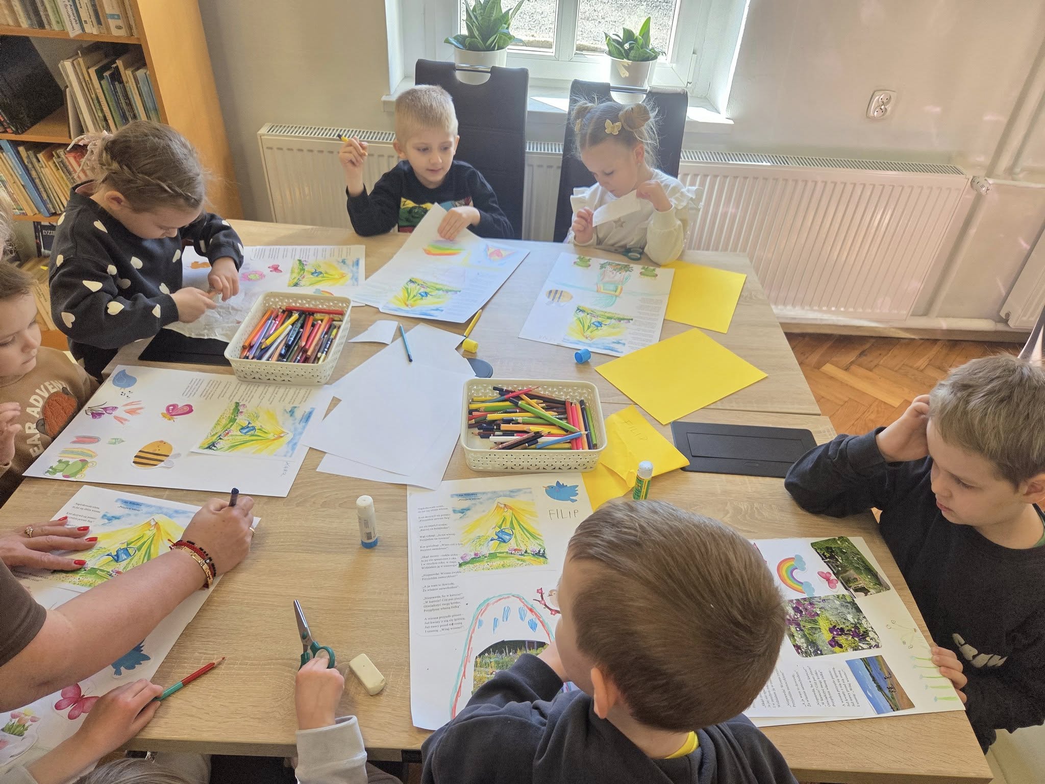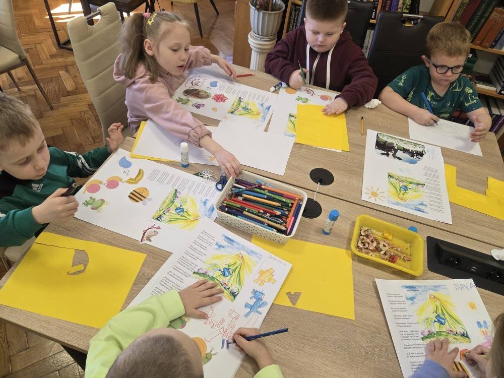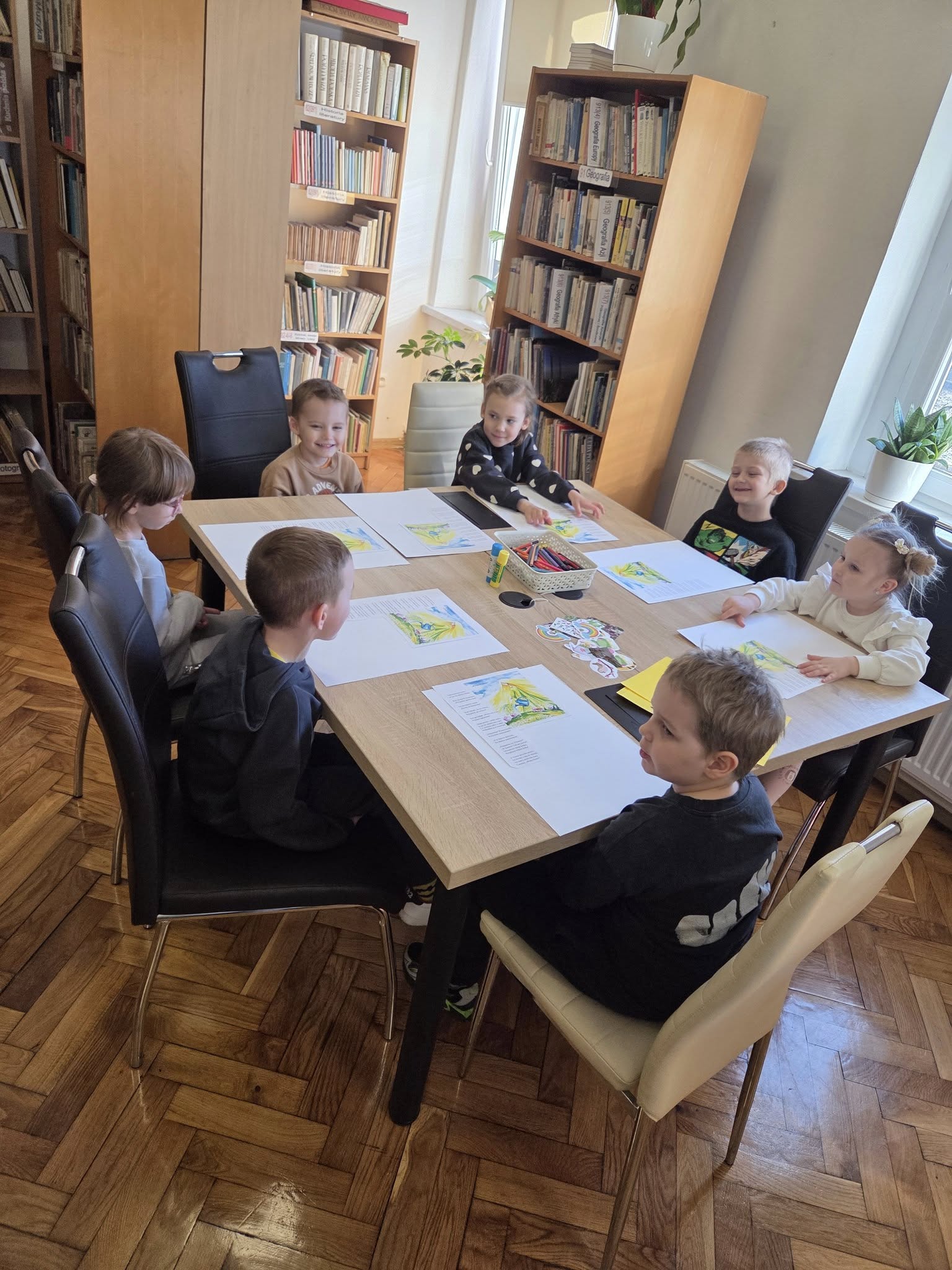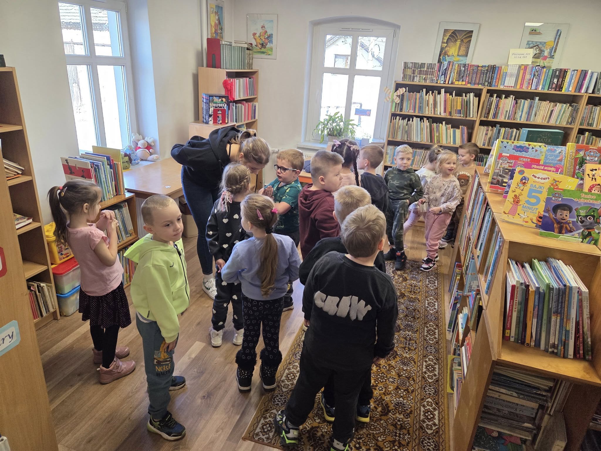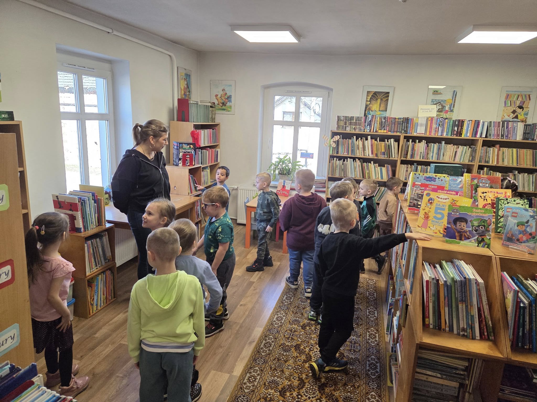 Dzieci uważnie słuchały czytanego przez panią wiersza Jana Brzechwy „Przyjście wiosny”, chętnie wypowiadały się na jego temat. Przy radosnej muzyce tworzyły kolorowe plakaty i zakładki do książek. Zwiedzały placówkę, dowiedziały się co należy zrobić, aby stać się czytelnikiem biblioteki oraz jak należy się w niej zachowywać. Poznały budowę książek oraz omówiły zasady dbania o nie. Dzieciom bardzo spodobały się kolorowe i bogato ilustrowane książki, które z chęcią oglądały. Spotkanie odbyło się w radosnej i pełnej uśmiechów atmosferze. Przedszkolaki obiecały często odwiedzać to ciekawe miejsce. Żegnając się zapewniały, że przyjdą ponownie, tym razem z rodzicami, by zapisać się do biblioteki i wypożyczyć książki.